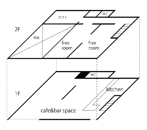 二階の一部屋を二週間借りて個展を開きたい、カフェバースペースを借りて料理付きの立食パーティーをしたい・・・などなどお気軽にご相談ください。